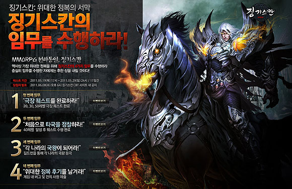 ‘징기스칸 온라인’가 보여줄 콘텐츠가 상당히 많기 때문에 테스트 기간도 비교적 길게 일정을 잡았으며, 서버 종료 없이 지속적으로 테스트 플레이가 가능하도록 준비하였다는 것이 라이브플렉스 관계자의 설명이다.