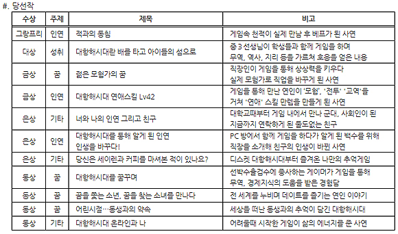 영예의 그랑프리는 게임 속에서 가장 강력한 천적이자 라이벌이었던 이용자들이 실제 만남을 가진 후, 지금은 둘도 없는 친구가 된 인연을 제출한 ‘적과의 동침’ (캐릭명 강길동군)이 선정되었으며, 감동 대상으로는 현직 중학교 3학년 교사의 사연 ‘대항해시대란 배를 타고 아이들의 섬으로’ 이다. ‘대항해시대란 배를 타고 아이들의 섬으로’는 같은 반 학생들과 함께 게임 `대항해시대 온라인`을 통해, 게임내에서 이뤄지는 각종 무역을 통해 경제를 가르치고, 게임 내 임무를 수행하며 자연스럽게 역사와 세계 지리 등도 배워가는 이야기를 담고 있다.