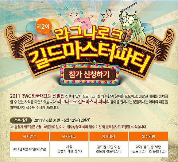 길드마스터 파티는 유저 간 화합과 친선을 도모하고, RWC 2011 한국대표팀 선발전을 미리 체험할 수 있는 행사로 작년에 이어 두 번째로 개최된다. 행사는 6월 18일 진행될 예정이며 이에 앞서 오늘(1일)부터 6월 12일까지 라그나로크 홈페이지 내 ‘문의하기’ 게시판을 통해 길드마스터 참가자 접수를 받는다.