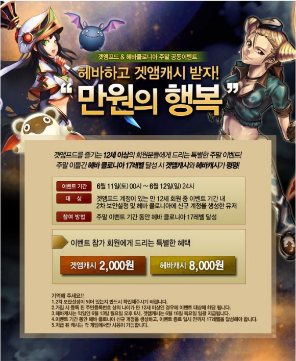 ‘헤바 클로니아’는 6월 11일 00시부터 12일 24시까지 주말 동안 ‘겟앰프드’유저가 헤바 클로니아 플레이 후 레벨 17 달성 시 캐시를 지급하는 공동 프로모션을 진행한다.