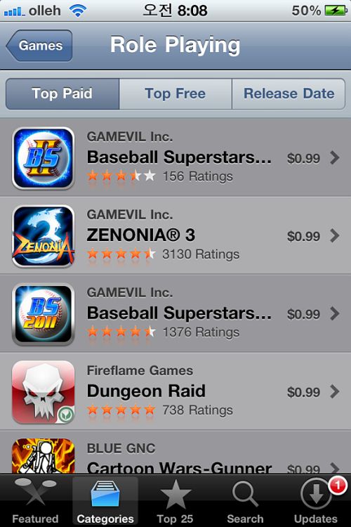 13일 기준(한국시간), 미국 애플 앱스토어의 RPG 장르 인기순위 Top 20에 7종의 게임빌 RPG가 포진되어 토종 모바일게임의 우수성을 세계인에게 전하고 있다.