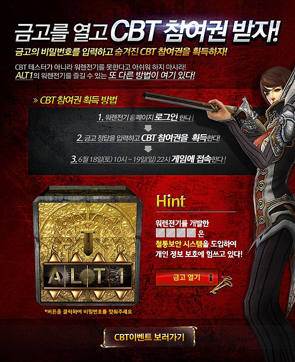 또한, 아쉽게 테스터에 당첨되지 않은 유저들을 위해 15일부터 19일까지 추가 CBT 참여권을 획득할 수 있는 이벤트를 진행한다. CBT 참여권이 든 금고를 열 수 있는 문제의 답을 맞추면 18일, 19일 양일간 워렌전기 테스트의 기회가 주어진다.