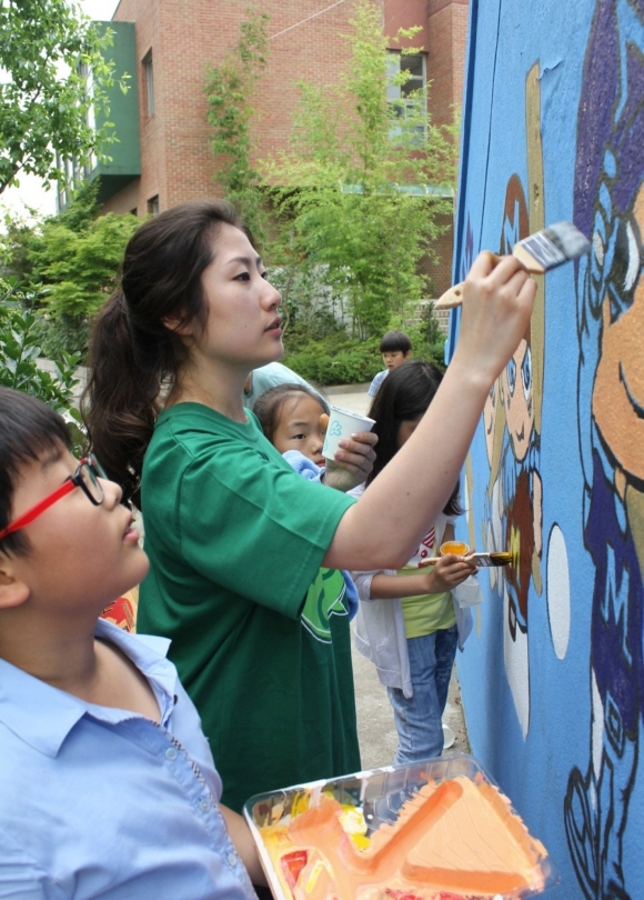 마포 마리스타 지역아동센터에서 아이들과 벽화그리기를 진행한 CJ E&M 직원들
