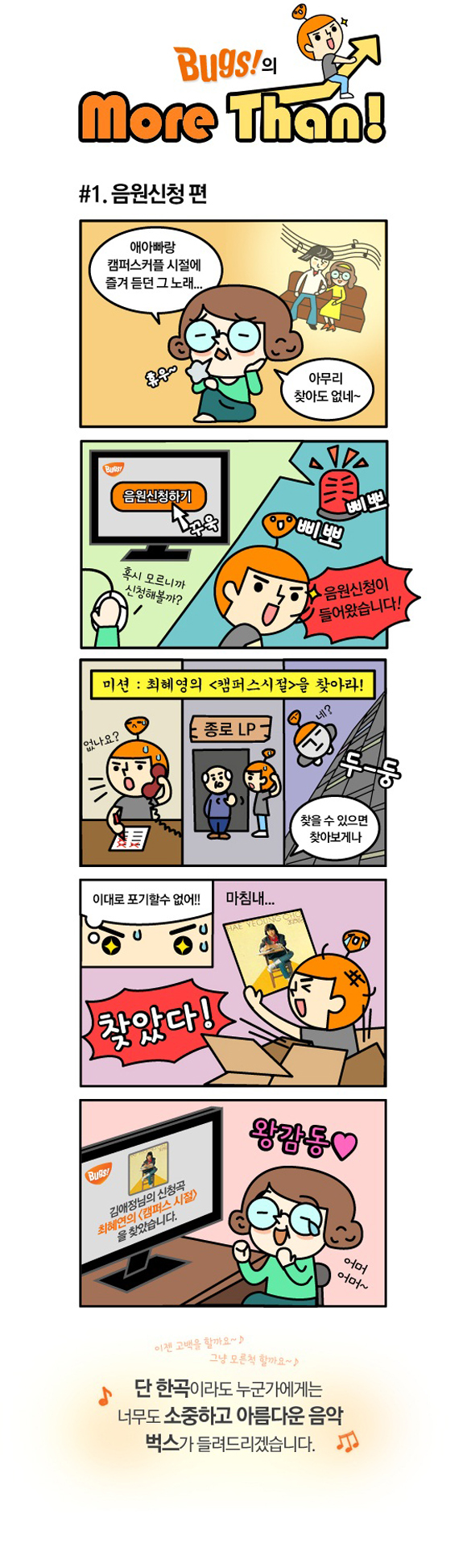 네오위즈인터넷이 서비스하는 음악포털 벅스(www.bugs.co.kr)는 음원 확보, 음악 다양성 확대, 신기술 접목을 골자로 고객만족을 극대화하기 위한 ‘More Than’ 캠페인을 시작한다고 12일 밝혔다.