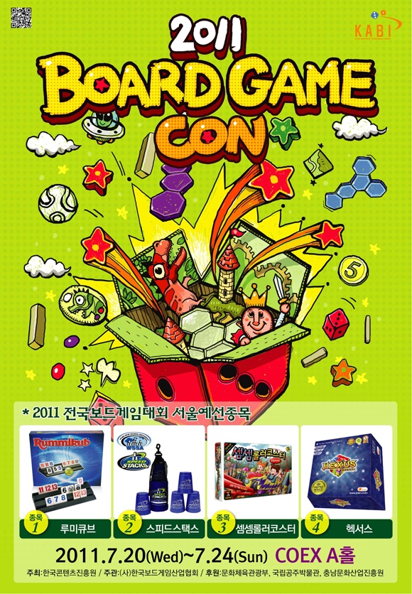 7월 20일(수) 오전 10시부터 진행되는 이번 행사는 전국보드게임대회의 서울 예선 대회가 같이 개최된다. 대회 종목으로는 ‘놀이속의세상’의 ‘루미큐브’, ‘생각투자의 ‘스피드스택스’, ‘행복한바오밥’의 ‘셈셈롤러코스터’, ‘조엔’의 ‘헥서스’ 등 4가지로 구성되어 있다. ‘루미큐브’는 세계적인 스테디셀러 보드게임으로 국내에서도 많은 인기를 누리고 있는 보드게임이며 ‘셈셈롤러코스터’는 사칙연산을 기본으로 재미있게 구성된 보드게임으로 교육적 활용도가 높은 게임이다. ‘헥서스’는 아름다운 보석큐브들을 쌓아가며 즐길 수 있는 3차원 보드게임으로 공간지능을 높여주는 보드게임이다. 생각투자에서 새롭게 선보이는 ‘스피드스택스’는 전세계적으로 유명한 스포츠 게임으로 미국에서는 수많은 초등학교에서 ‘스피드스택스’를 체육과목으로 채택할 정도로 인기가 많은 스포츠 게임이다.
