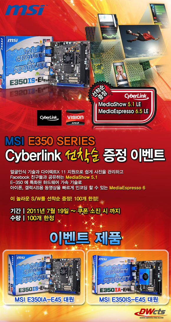 대원CTS는 AMD Brazos 프로세서를 기본 장착한 MSI E350IA-E45와 E350IS-E45 구매자에게 10만원 상당의 사이버링크(CyberLink) MediaShow 5.1 LE와 MediaEspresso 6 LE 쿠폰을 증정하는 행사를 100장 한정으로 실시한다.