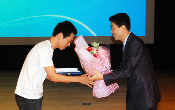 컴투스 최백용 이사가 7월 25일 코엑스 오디토리움에서 개최된 제1회 KUGC(Korea Unity Game Contest, 유니티 스마트폰 게임 개발 공모전) 시상식장에서 ‘컴투스상’ 수상자로 선정된 Doouky팀에게 트로피와 축하 꽃다발을 전달하고 있다.