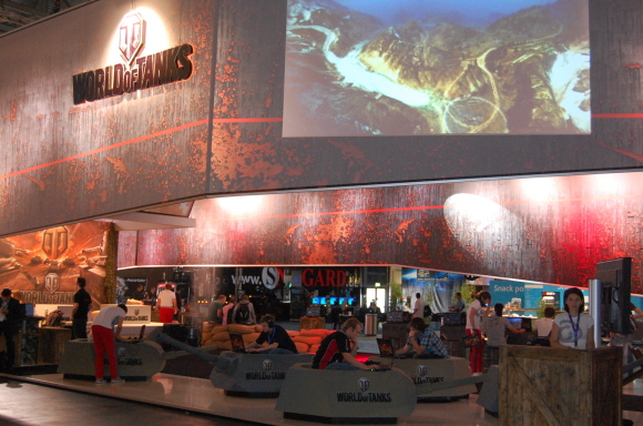 탱크 모양의 시연대에서 `월드 오브 탱크` 게임을 즐기는 관람객들