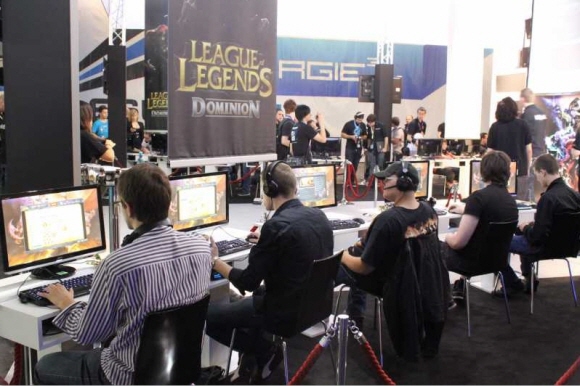 오브 레전드` 대전 시연대 광경, 많은 사람들이 게임을 즐기고 있다