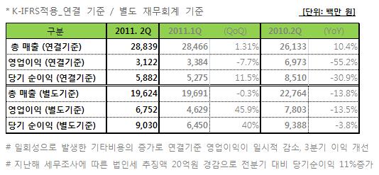 2011년 2분기 위메이드는 연결기준으로 매출액 288억 원, 연결영업이익 31억 원, 연결순이익 59억 원, 별도기준으로 매출액 196억 원, 영업이익 68억 원, 순이익 90억 원을 기록했다.