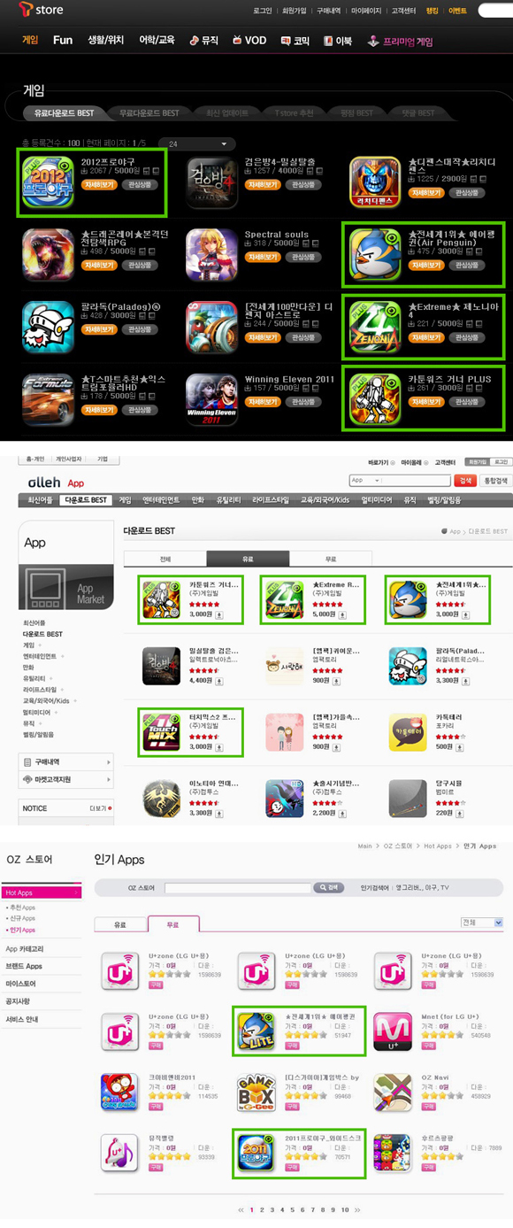 현재 olleh 마켓의 유료 게임 순위에서는 ‘카툰워즈 거너’, ‘제노니아4’, ‘에어 펭귄’ 이 1, 2, 3위를 모두 차지했으며, 무료 게임 순위에서도 ‘카툰워즈 거너’ 와 ‘터치믹스 프리미엄’ 이 1, 3위에 랭크되어 있다.