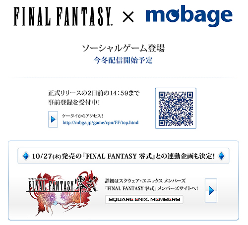 소셜게임 ‘파이널판타지’는 오는 겨울에 출시되며, 최근 발매가 시작된 PSP 타이틀 ‘파이널판타지:영식’을 구매한 이들에게는 추후 추가 혜택이 부여될 예정이다.