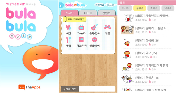 ‘블라블라’ 의 커뮤니티 게시판에서는 이성에 관한 이야기 외 TV/스타, 음악/영화/게임/맛집/학교/직장/일상 유머 등 주제별 다양한 대화를 나눌 수 있고, 동일한 관심사에 대해 소소한 이야기를 공유할 수 있다. 많은 공감을 얻은 게시물은 일일,주간,월간 베스트 카테고리에 등록되어 더 많은 사용자와 공감대를 형성할 수 있고, 사용자간 1:1 커뮤니케이션이 가능한 쪽지 기능이 제공된다.